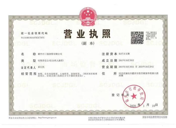 霸州市三強制管有限公司成立于2014年10月,公司坐落在北方工業重鎮勝芳鎮廊大路西側(津保高速勝芳出口南1公里),交通便利。公司占地70畝,擁有先進的焊管機組、固態高頻、冷切鋸,并擁有先進的冷彎型鋼機組,配有相應的沖孔、激光加工設備,整鏈條式服務,質量優,交期塊。